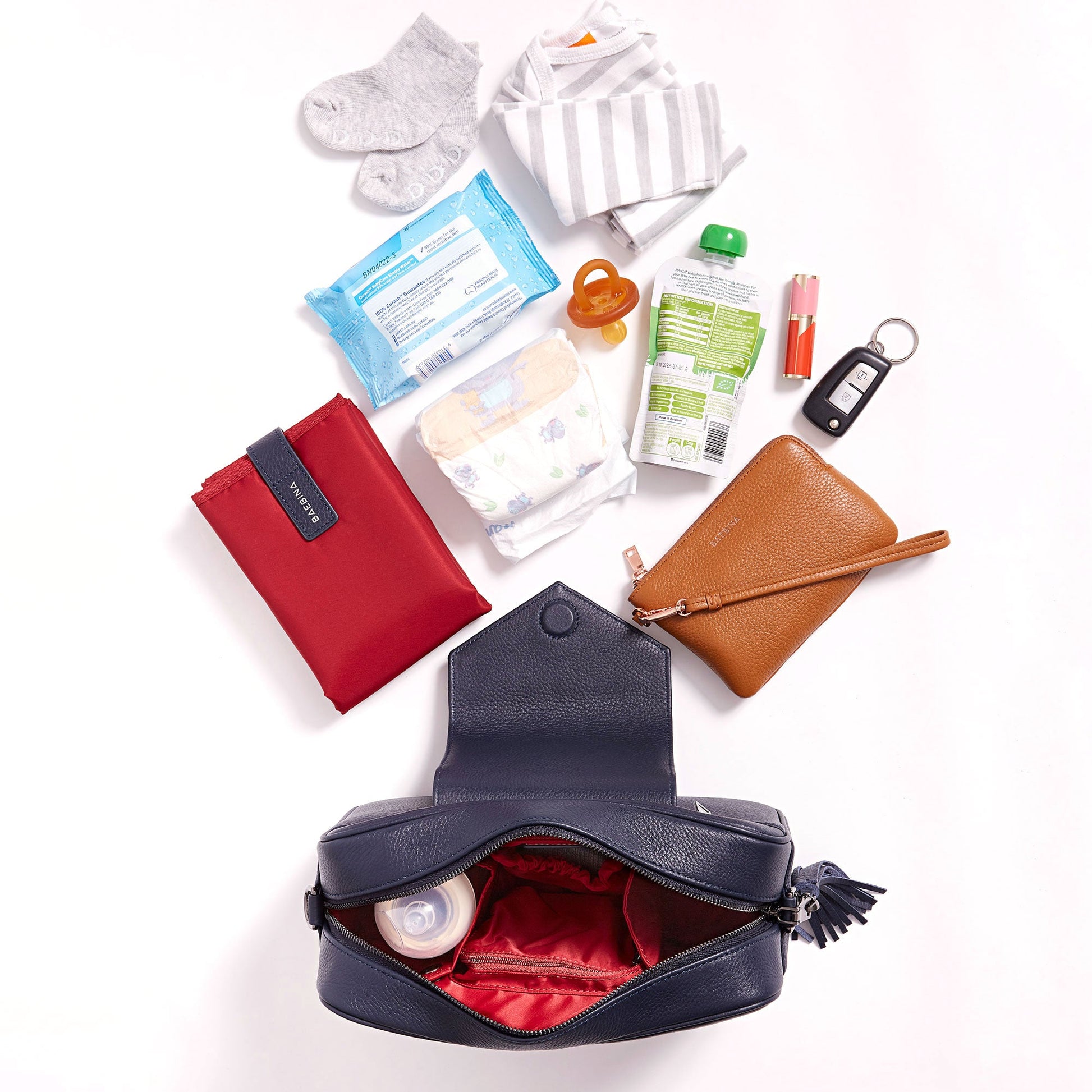 Go between crossbody bag and pram bag in seconds with easy to use pram straps that come included. Internal compartments perfectly accommodate baby bottles, nappies, snacks and your things too.