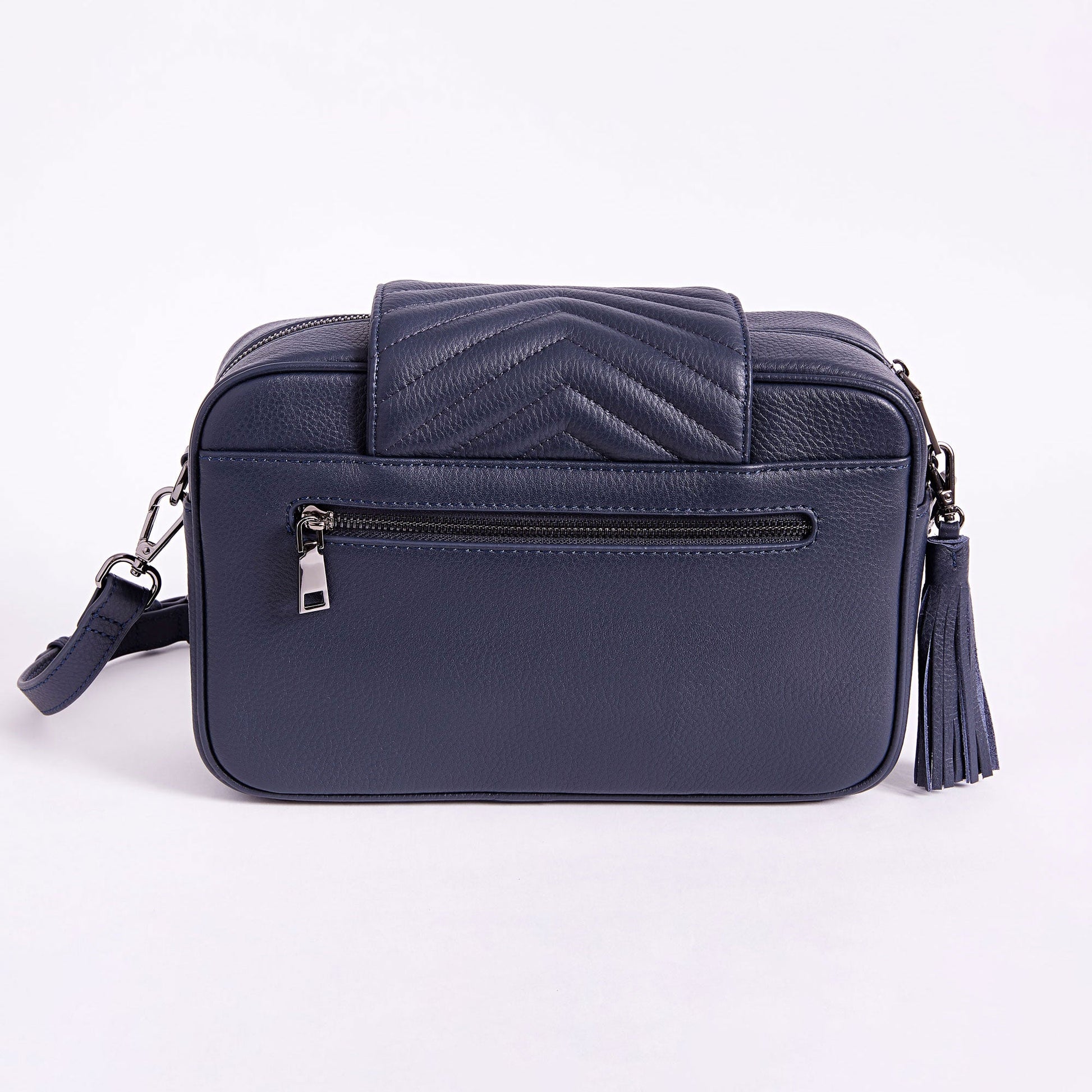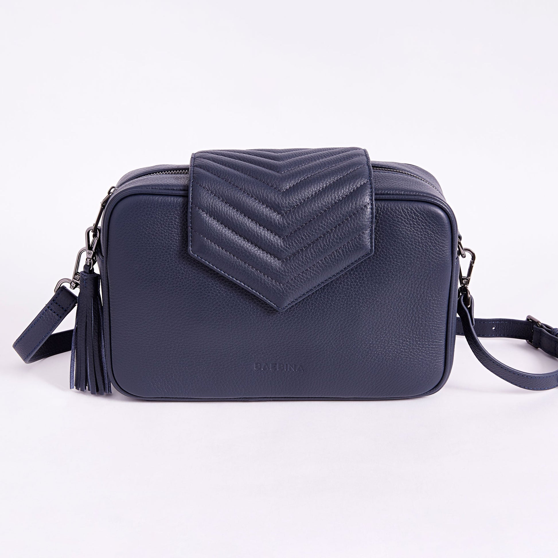DETAIL: Embossed logo, removable leather tassel